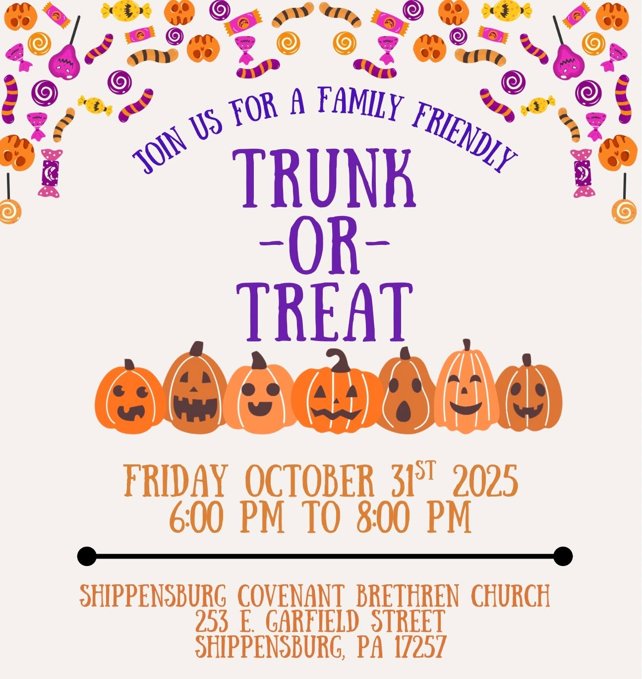 Join us for trunk or treat.If you are in the area trick or treating, stop by for some additional treats.Even if you aren’t in the area feel free to come by the church!Can’t wait to see all the fun costumes. |